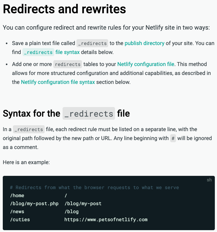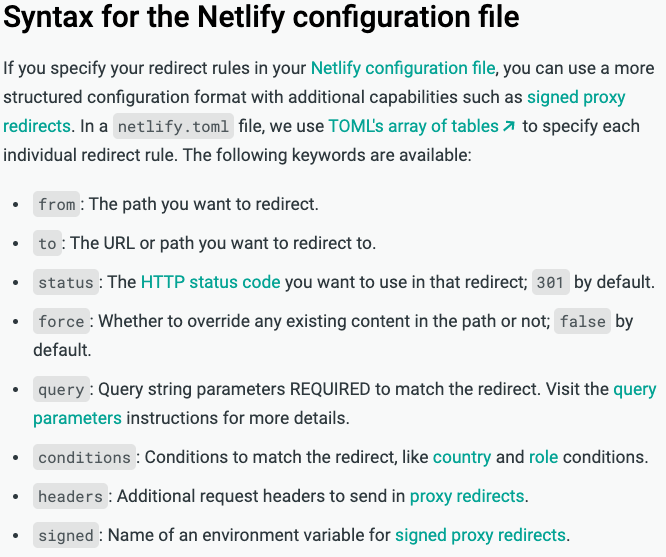 https://docs.netlify.com/routing/redirects/#syntax-for-the-redirects-file Netlify에선 친절하게 공식 문서에 리다이렉트 설정 방법이 있었습니다.