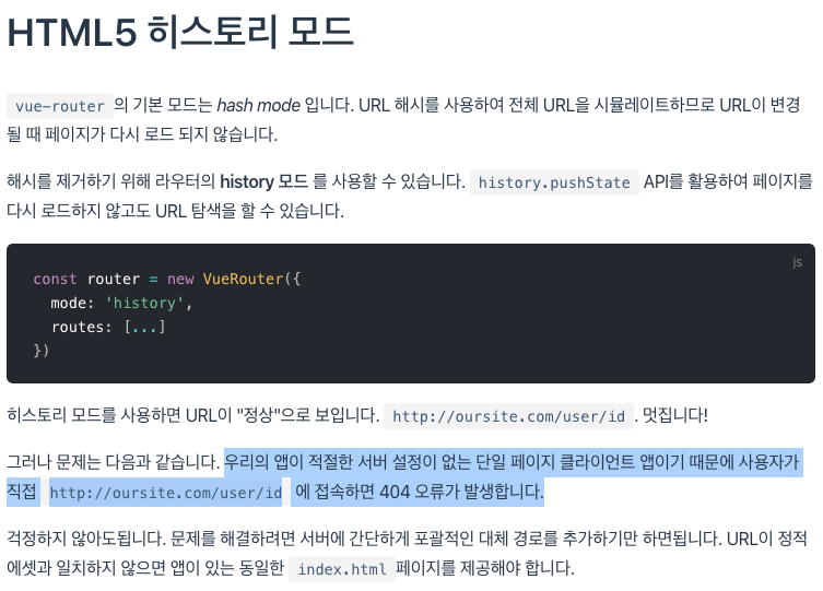 하단의 문제점이 적혀 있지만, 히스토리 모드에서 404오류가 를 해결하려고 리다이렉트 설정을 해줘야 했습니다.