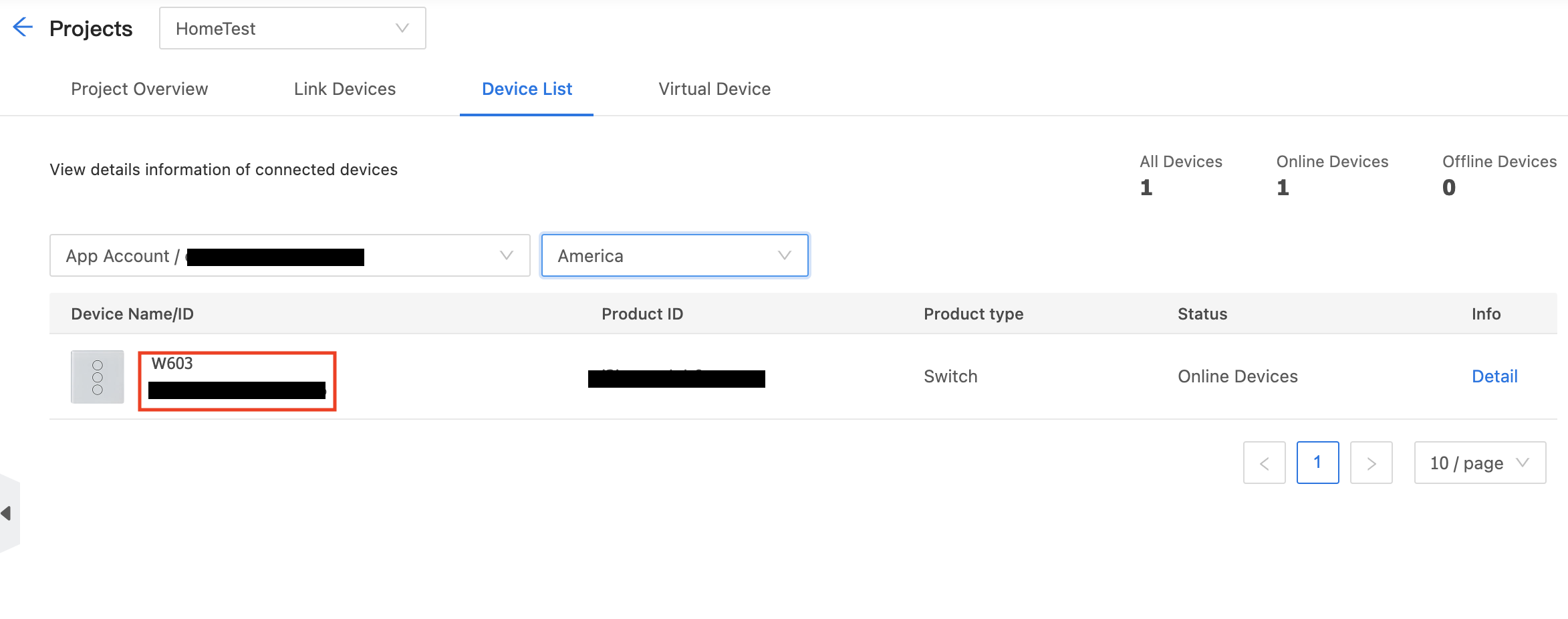 Link Device 탭 스캔을 한 이후, Device List 탭으로 들어가면 오른쪽 상단에 등록된 디바이스 숫자가 노출됩니다. 저같은 경우 디바이스 숫자는 1이였는데, 아래 테이블에 디바이스가 노출되지 않았습니다. 그런 경우 나라 셀렉트 폼을 다른 것으로 수정하면 확인 가능합니다. 저 같은 경우에 America로 되어 있었습니니다.