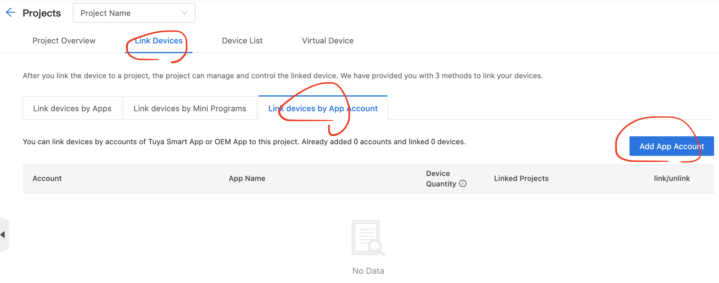 Project Overview 탭 그리고 어플과 연결시켜줘야 합니다. Link Devices - Link devices by App Account - Add App Account 를 눌러줍니다. 버튼을 누르면 팝업으로 QR코드가 노출되고, 어플에서 QR코드를 인식해야합니다. Smart Life 어플에서 맨 오른쪽 설정 탭으로 가면 스캔을 할 수 있는 기능이 있습니다. 해당 기능으로 QR코드를 스캔해 주십시오.