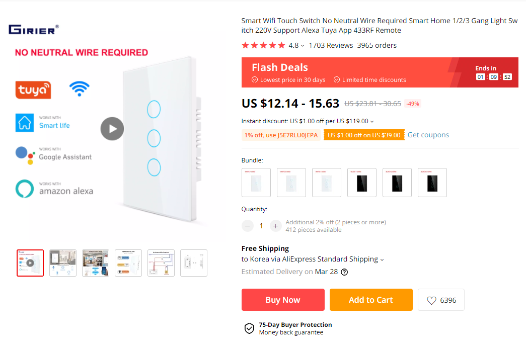 3구 스위치 약 2만원정도 주고 구입 스마트 벽 스위치 제품은 Girier사의 3구 제품을 알리 익스프레스에서 구매하여 사용하였습니다.