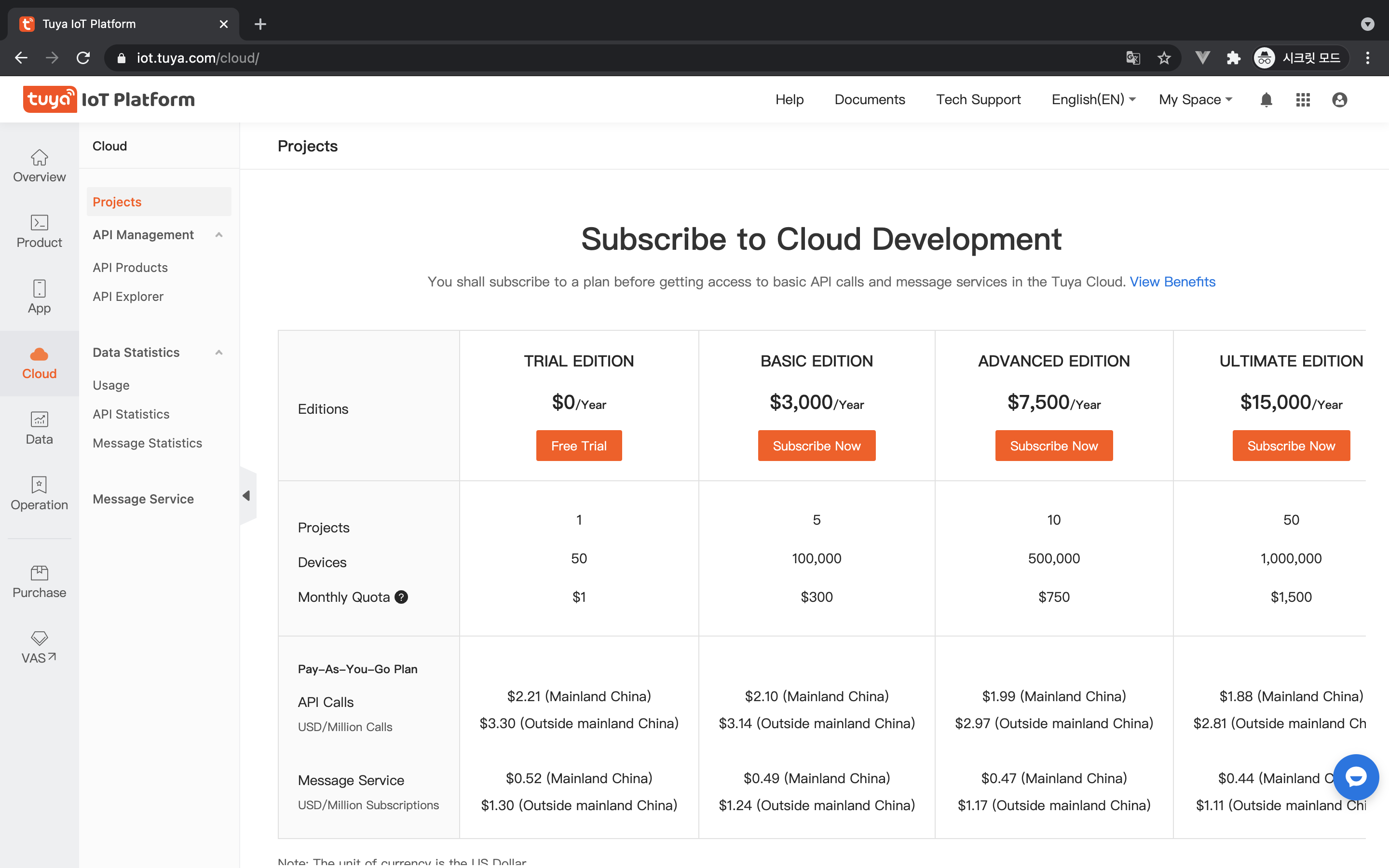 플랫폼에 가입하여 Cloud - Project를 누릅니다. 계정을 이제 만들었으면, 요금제를 선택하라는 창이 뜹니다. Free Trial로도 할 수 있습니다.