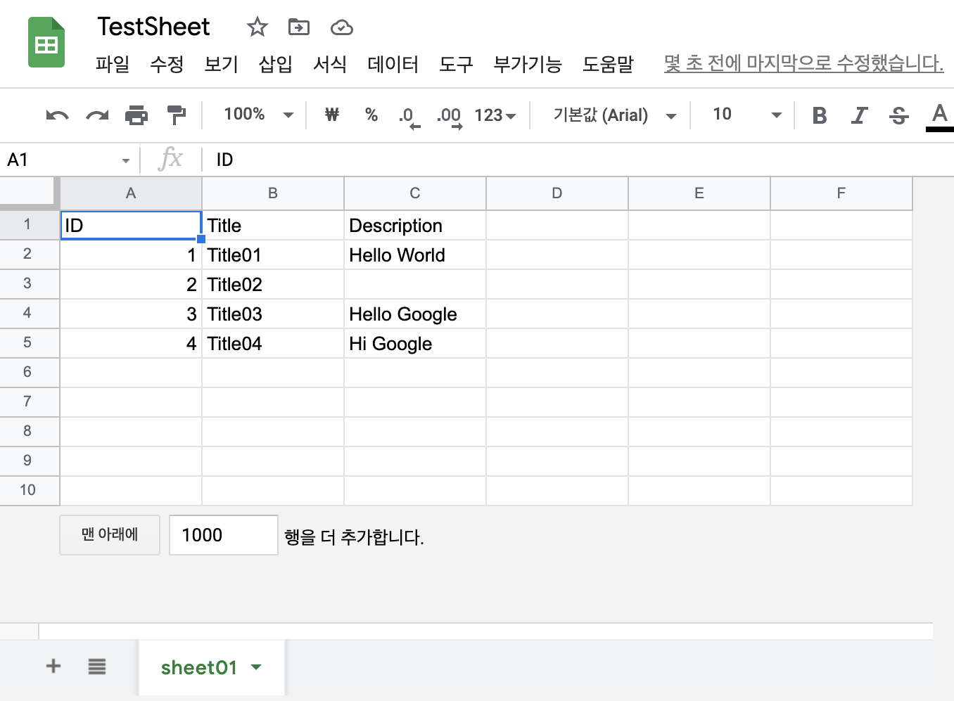 우선 Google Spreadsheet를 하나 생성하고 임의 데이터를 입력합니다.