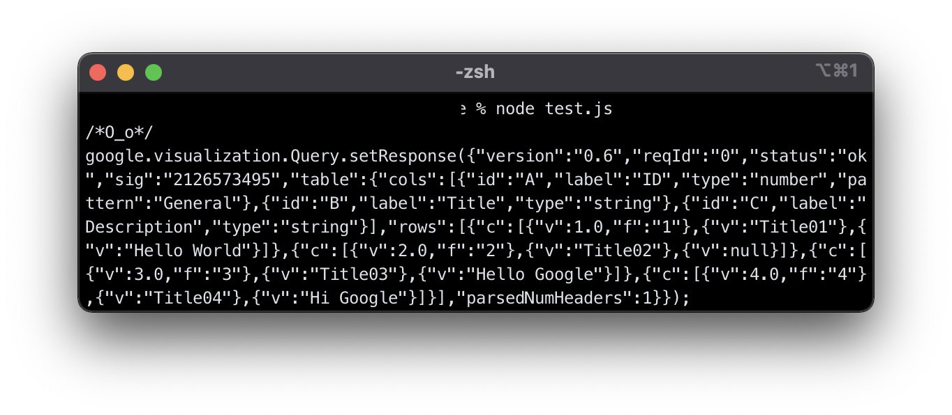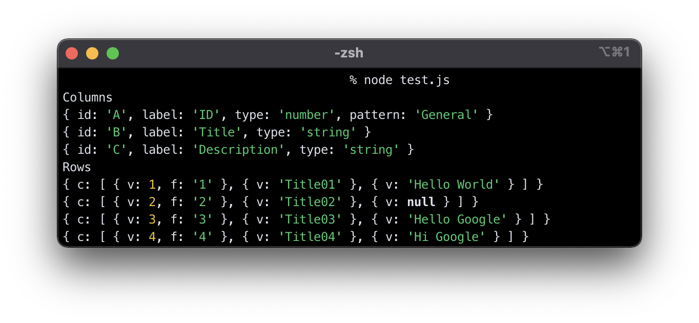 이쁘게 col, row 형태로 데이터가 조회되는 것을 확인 할 수 있습니다. 이해하기 어려우시면 맨 위의 시트 예제와 함께 데이터를 비교해주세요. 이렇게 파싱된 데이터를 원하는 형식으로 가공해서 사용할 수 있습니다.
