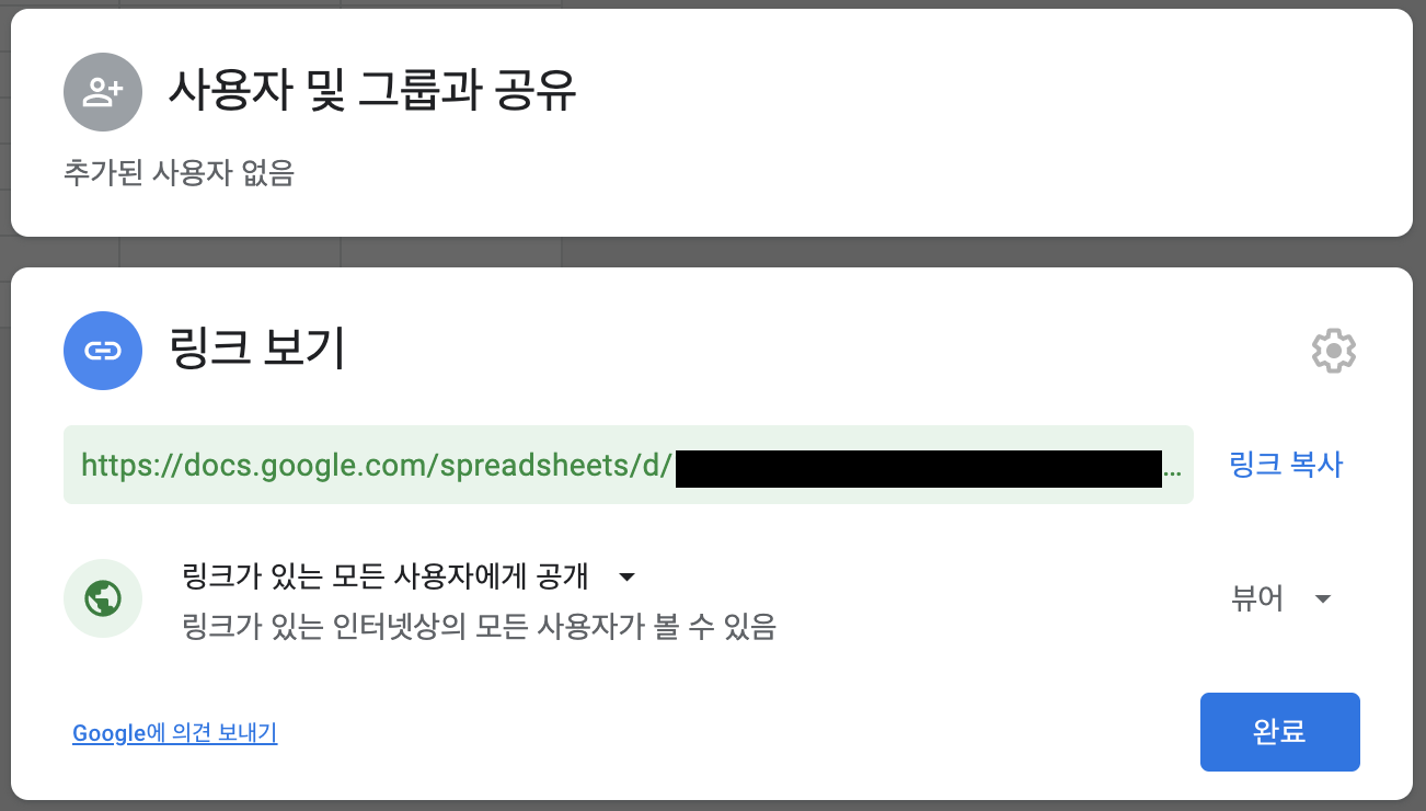외부에서 해당 시트를 조회 하려면, 외부에서 접근 가능하게 링크 공유 설정을 수정해줍니다. 링크가 있는 모든 사용자에게 공개로 설정해주세요.