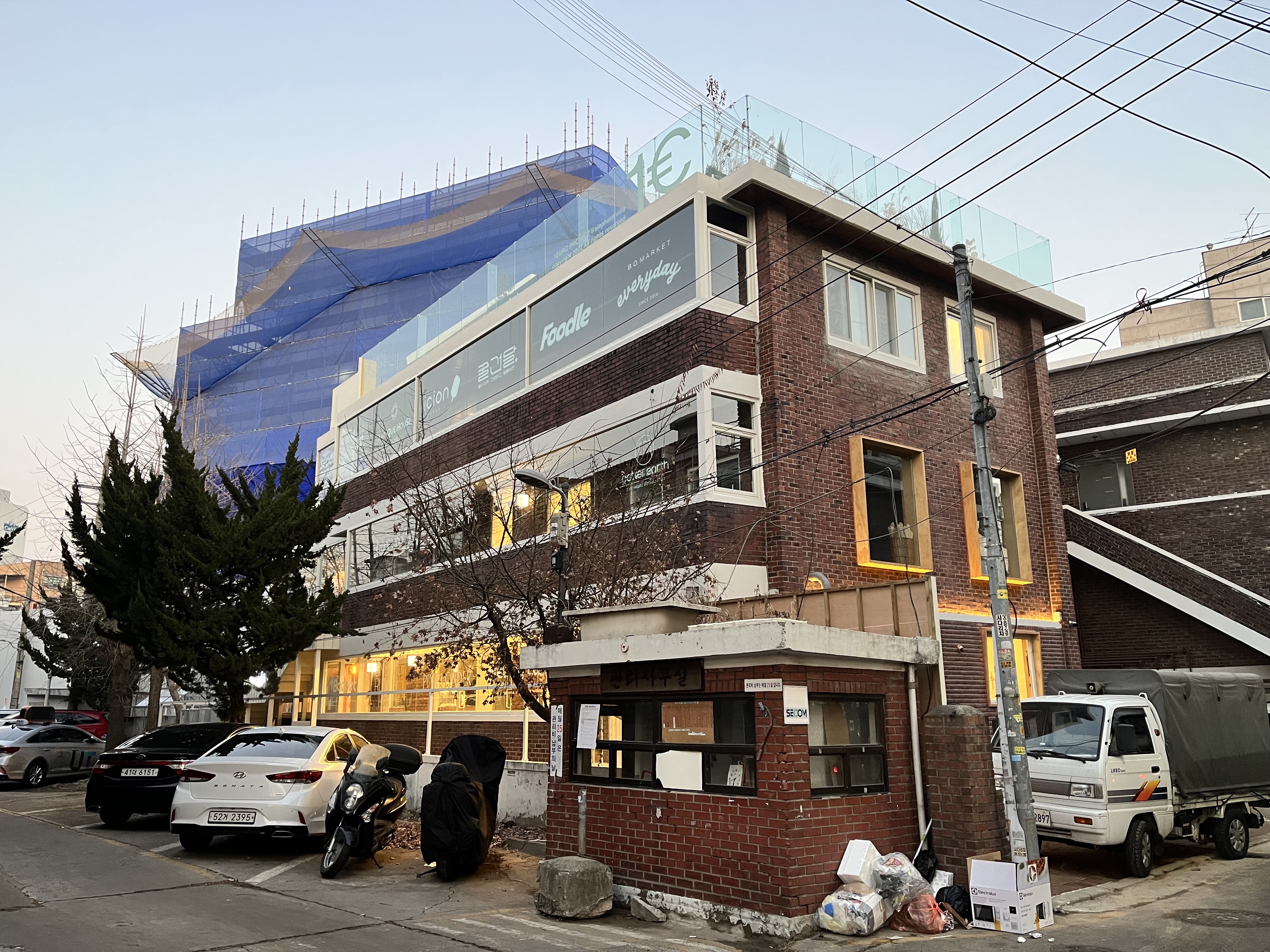 최근 동네의 중랑천을 따라 걷다가 공사 중인 공간을 발견하였습니다. 성동구 송정동 코끼리 빌라에 상업 공간이 들어오고 있었습니다.