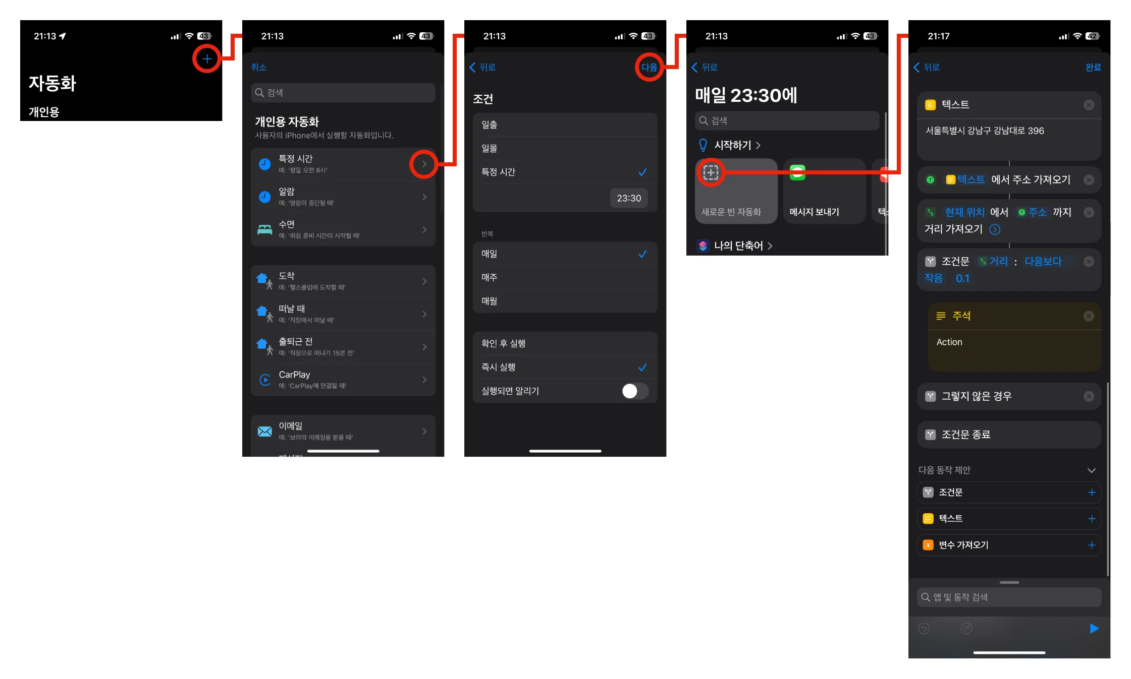 상황을 상세히 설명을 하면, 오후 11시 30분 취침 시간이 되면, 집의 조명도 끄고, 아이폰 알림도 끄는 수면 모드를 활성화 하고 싶습니다. 하지만 매일 집에 있는게 아니라서, 집에 있을 때만 실행하고 싶습니다. 이러한 경우 매일 오후 11시 30분 마다 현재 위치를 확인하고, 위치가 집이면 수면 모드를 활성화 하게 할 수 있습니다.