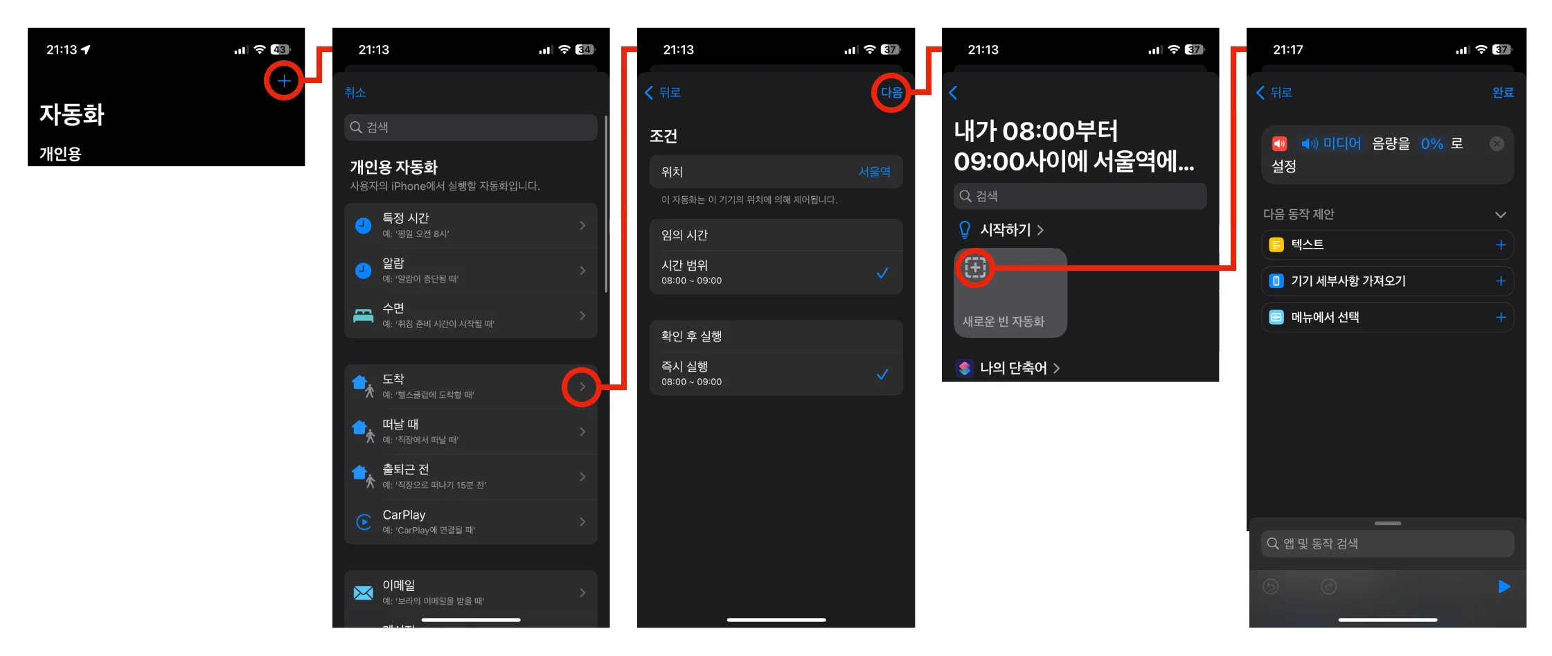 위치 기반 트리거(도착, 떠날 때)등을 선택 하면, 이전 버전과는 다르게, 시간 범위와, 즉시 실행 여부를 선택할 수 있습니다.
