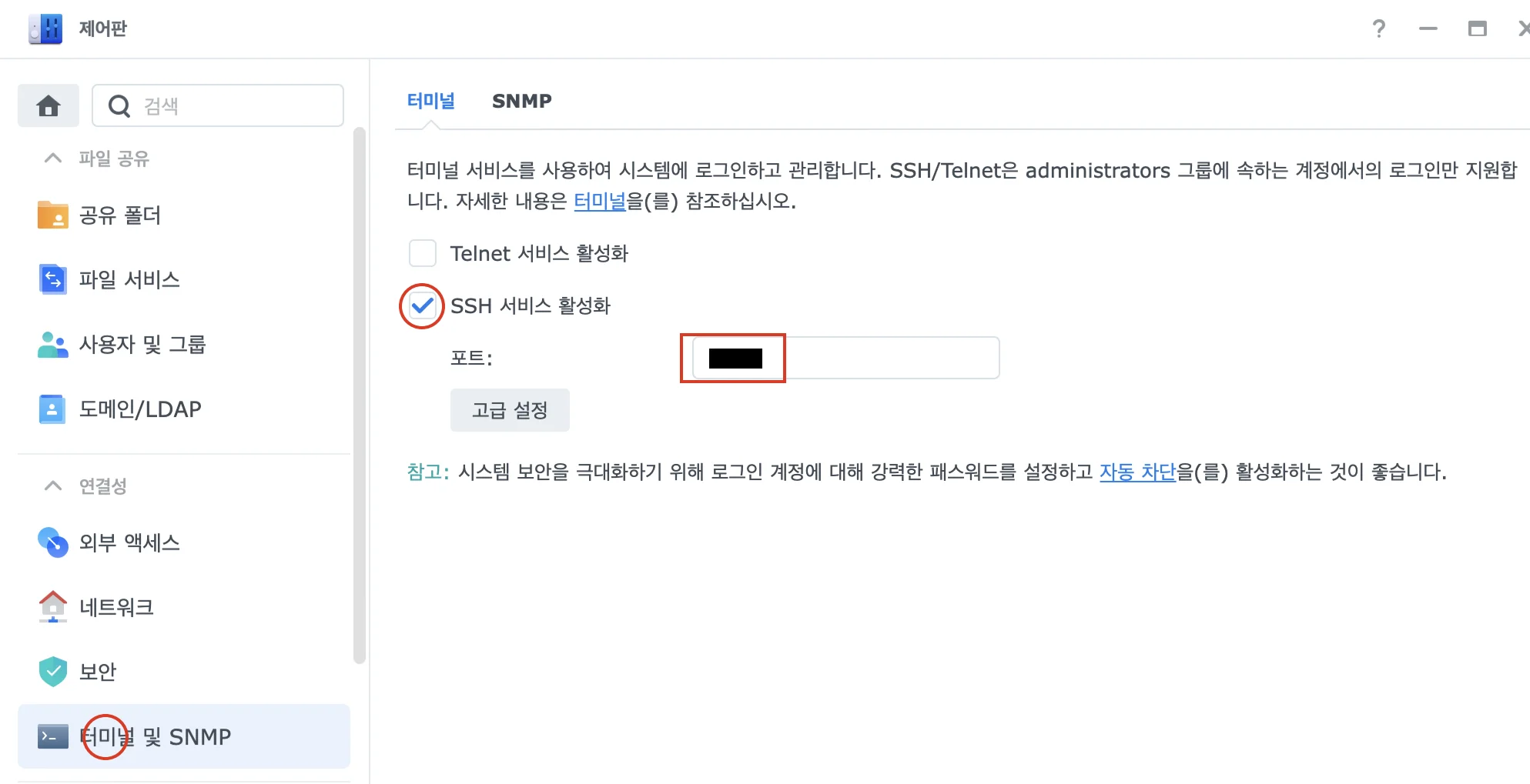 터미널 및 SNMP 설정 "제어판 - 터미널 및 SNMP" 설정으로 이동하여 SSH 서비스 활성화를 체크합니다.