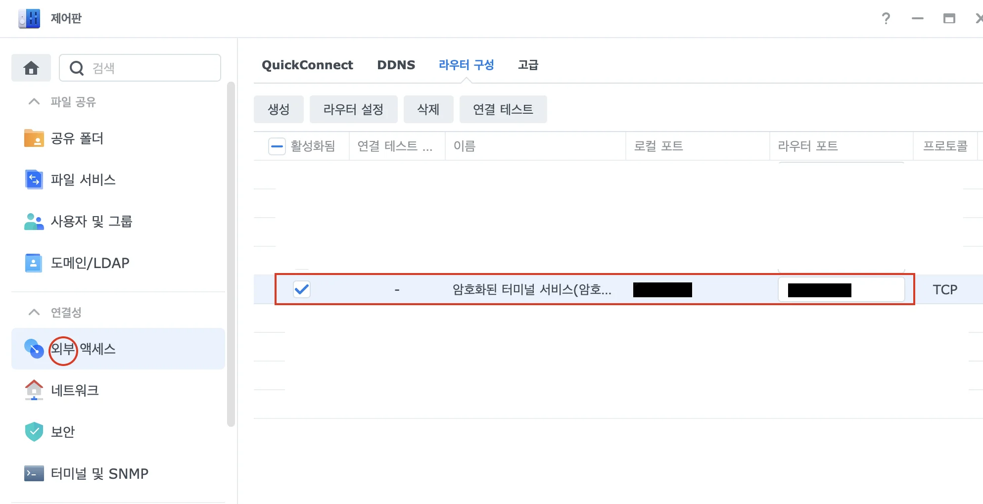 외부 엑세스 설정 "제어판 - 외부액세스" 설정으로 이동하여 외부에서 SSH 포트로 접속 가능하게 설정해줍니다.