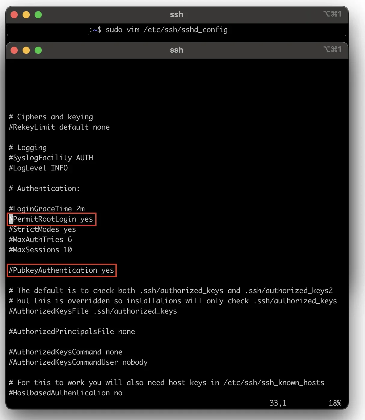 sshd_config 수정 "sudo vim /etc/ssh/sshd_config" 명령어를 사용하여 ssh 접속 설정 문서를 수정합니다.