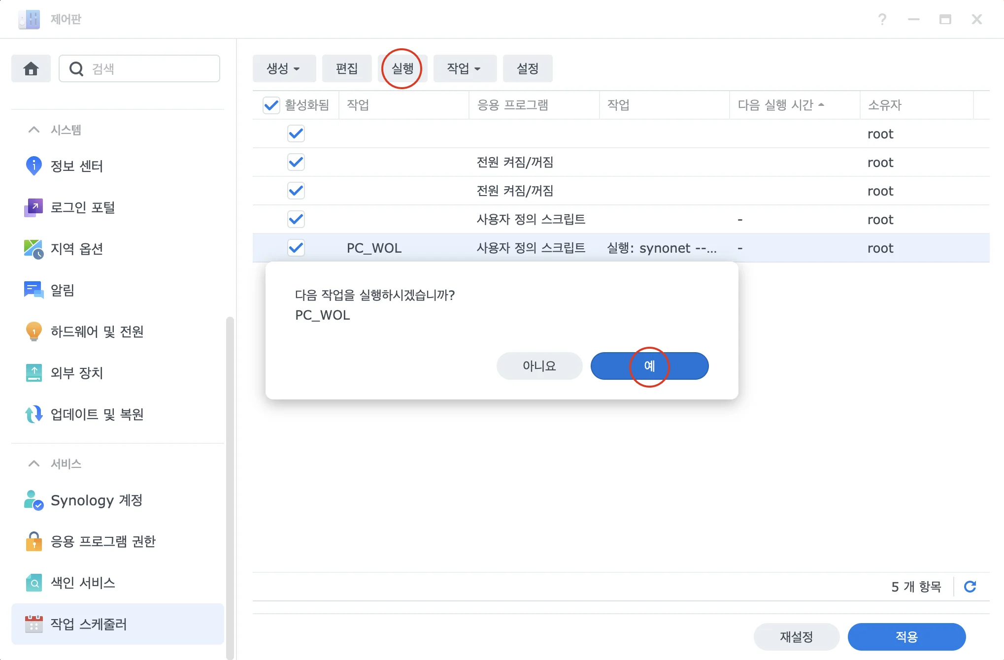 2. Synology NAS의 작업 스케쥴러에서 WOL 기능을 추가한다.