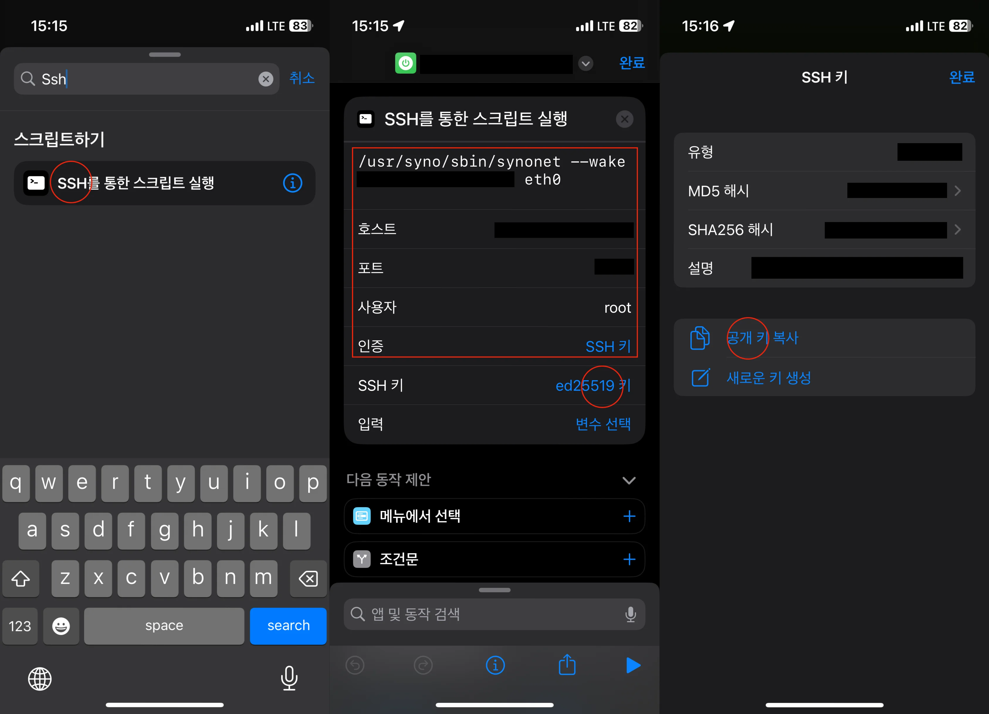 아이폰 단축어 아이폰 단축어에서 "SSH를 통한 스크립트 실행" 단축어를 하나 생성합니다.
