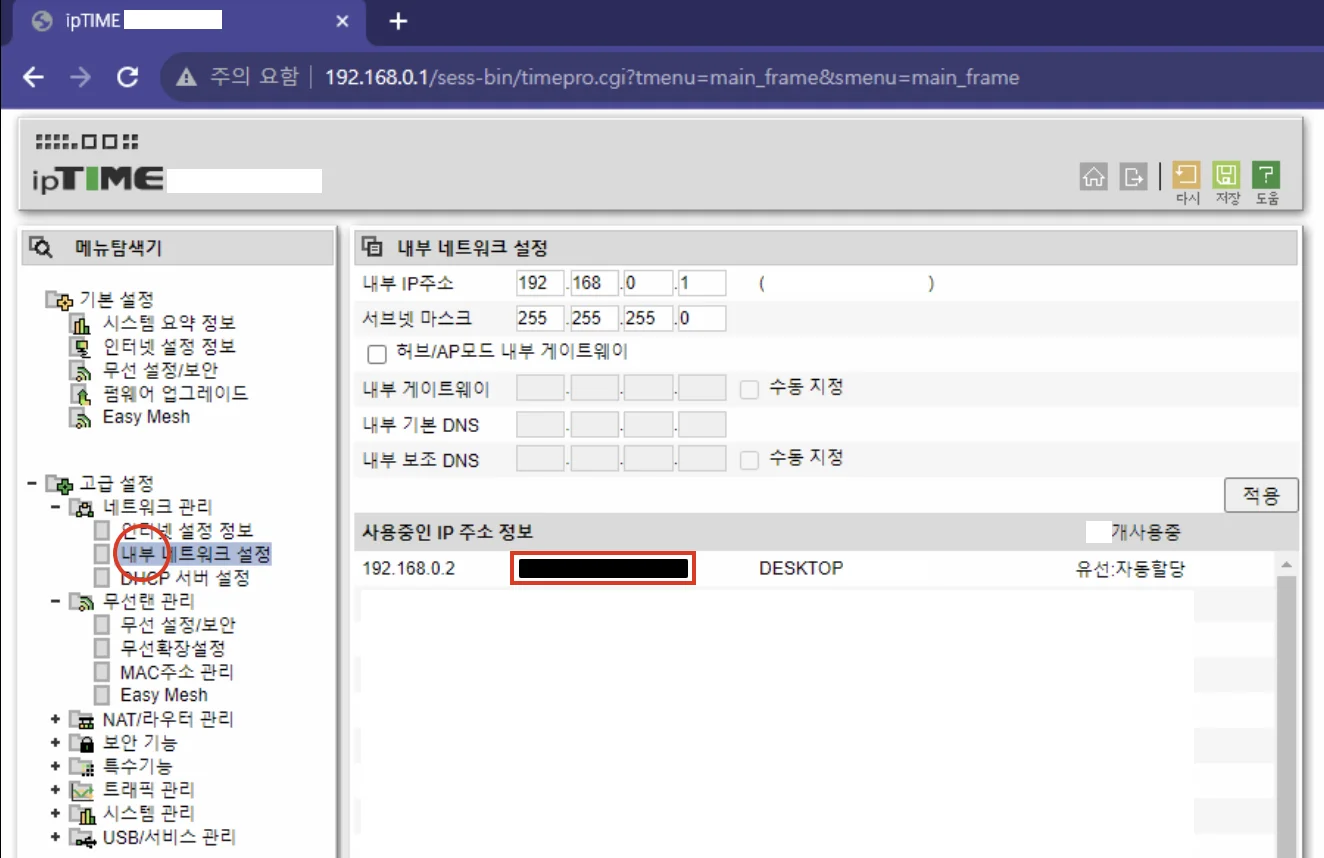 저는 iptime 공유기를 사용하고 있어, 공유기 관리 페이지에 들어가서 확인 하였습니다.