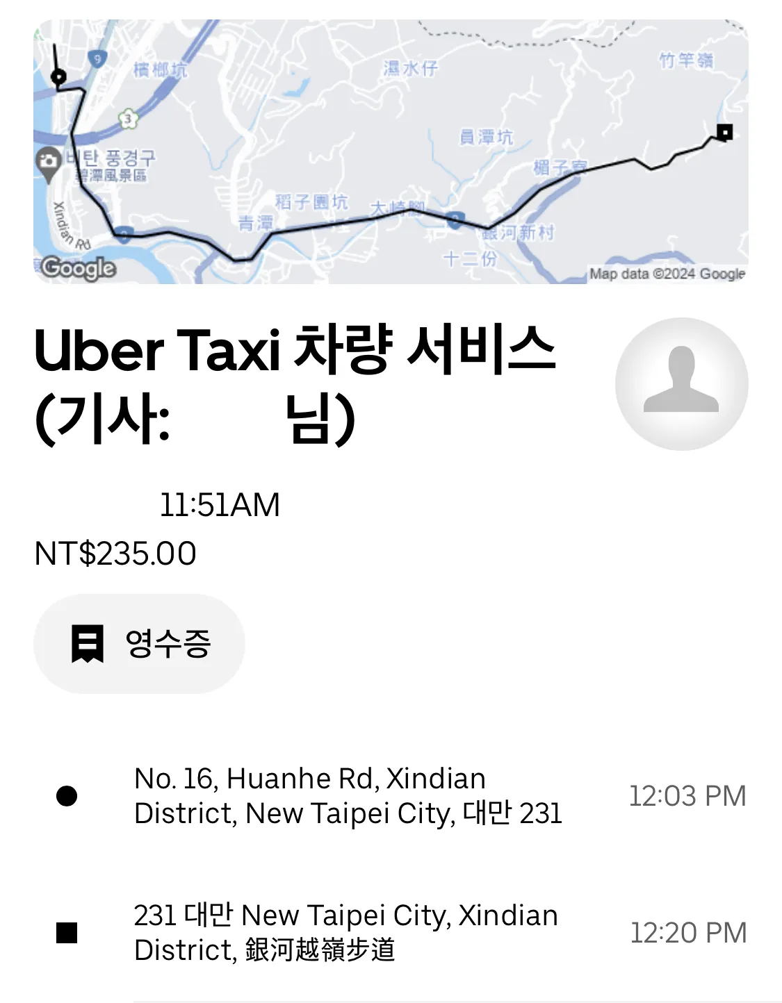 우버 이동 내역 우버는 약 20분 정도 이동 하였고, 235 대만 달러가 나왔습니다.